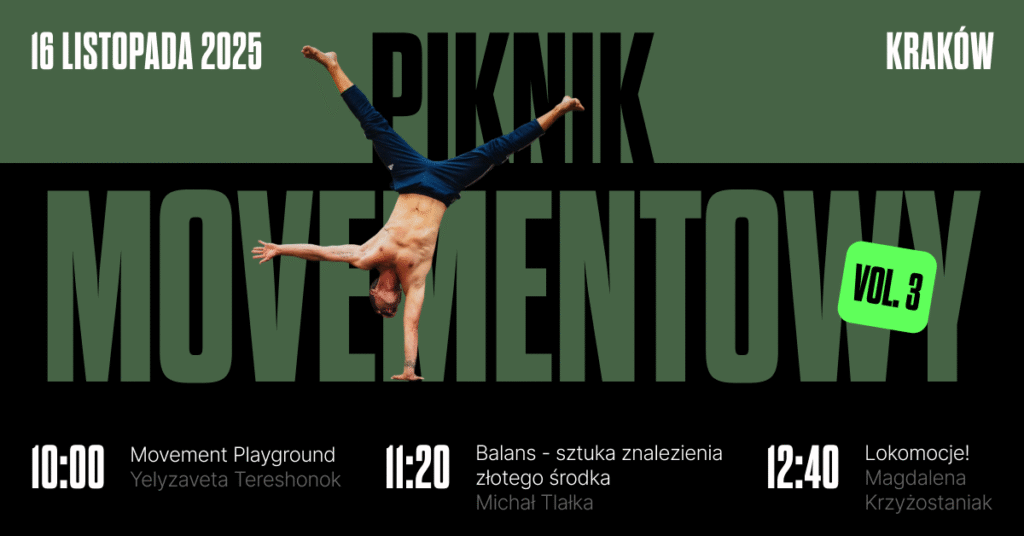 Nadchodzące wydarzenia Nadchodzące wydarzenia Zajęcia otwarte W każdy piątek w parku Jordana w Krakowie spotykamy się, aby zgłębić temat movementu i handstandu oraz aby zbudować społeczność wokół Ruchu. 7:00-7:55 Spine and balance – popracujemy ze wszechstronnością kręgosłupa i jak zarządzać ciałem podczas balansu.8:00-8:55 Handstand and softacro- na tych zajęciach poznamy różne pozycje odwrócone, wzmocnimy ciało i przełamiemy strach bycia do góry nogami. Link do zapisu dostępny TUTAJMiejsca nieograniczone – po prostu wpadnij! 🙂